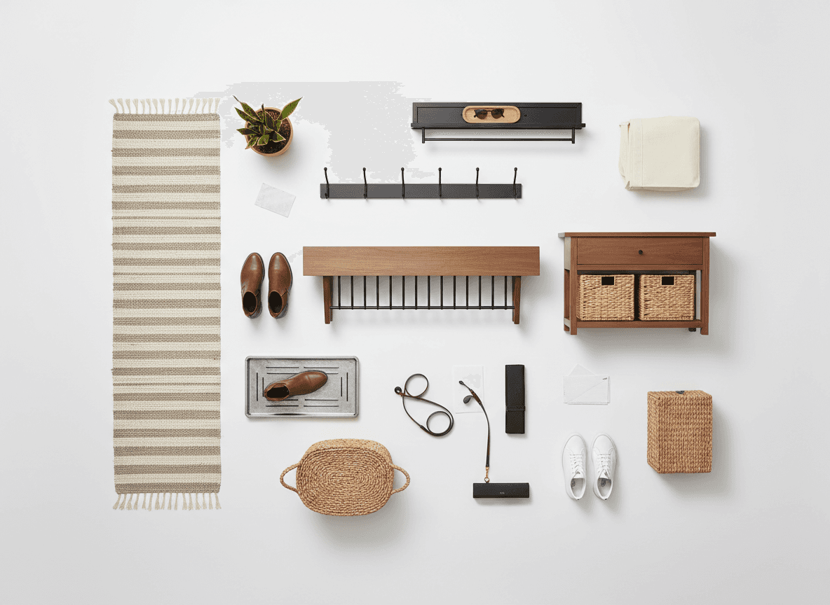 The anchor piece is a bench with shoe storage underneath. Position it against the wall closest to the door, not the wall you see first. I know thats counterintuitive. You want the drop zone near the action, not displayed like art.