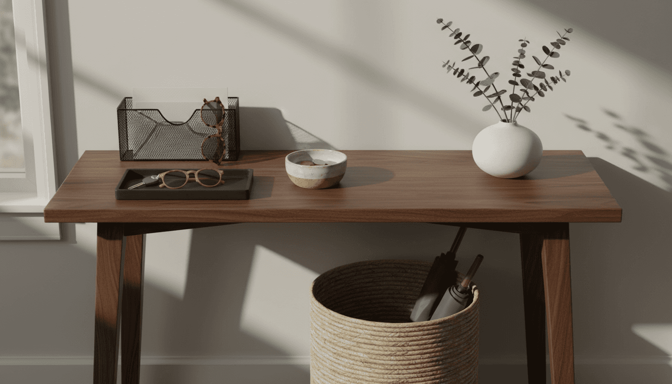 On the opposite wall or on a perpendicular surface, a narrow console table with at least one drawer. The drawer is for the junk that doesn't have a category. Sunglasses. Chapstick. The spare car key. The top is for a small tray and maybe one thing that makes you feel something when you walk in. A candle. A photo. One thing.
