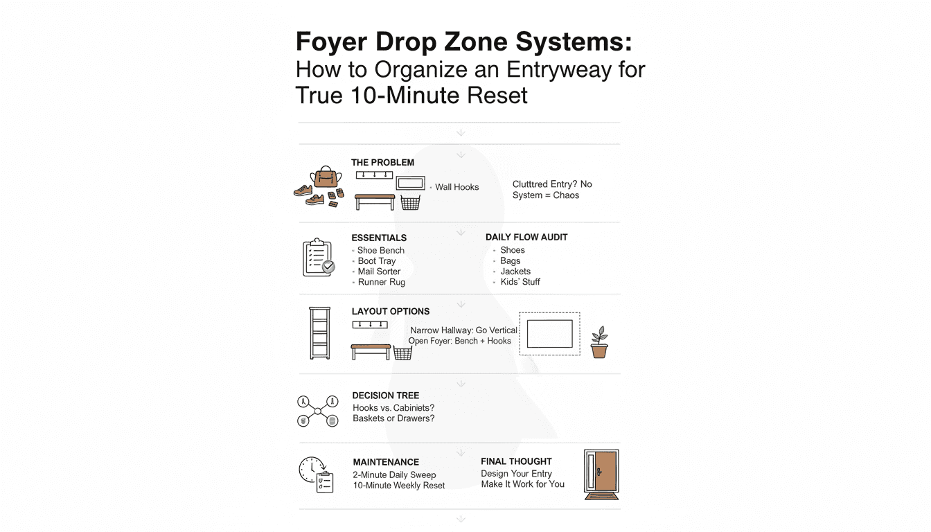 Your foyer does more work than any other room in your house. Here's how to set up a drop zone that actually holds up, with three layouts and a weekly reset routine that takes ten minutes flat.