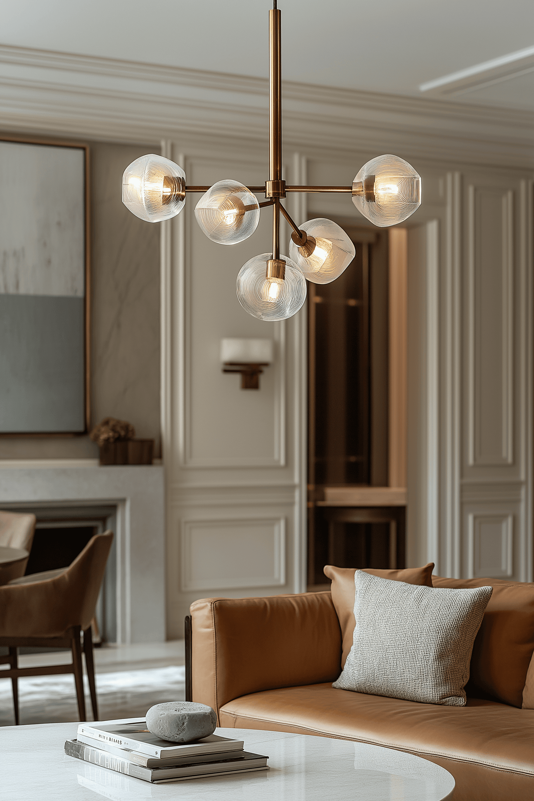 Lighting: Be mindful of low-hanging lighting like chandeliers or sconces. Hang art so it aligns harmoniously with lighting fixtures without overwhelming them.