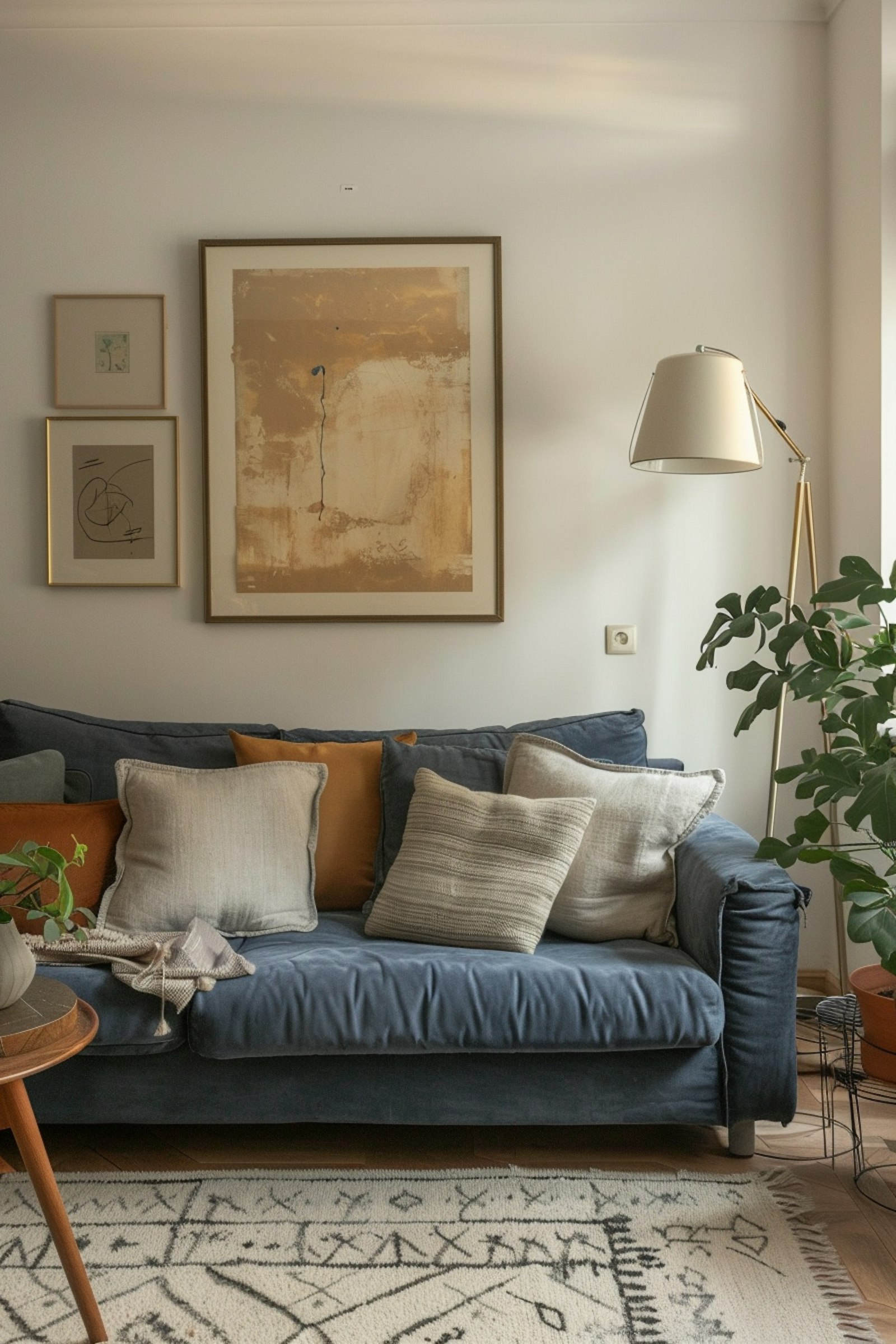 Height: Hang the bottom of the artwork 6-8 inches above the sofa back. If it’s too high, it will feel disconnected.